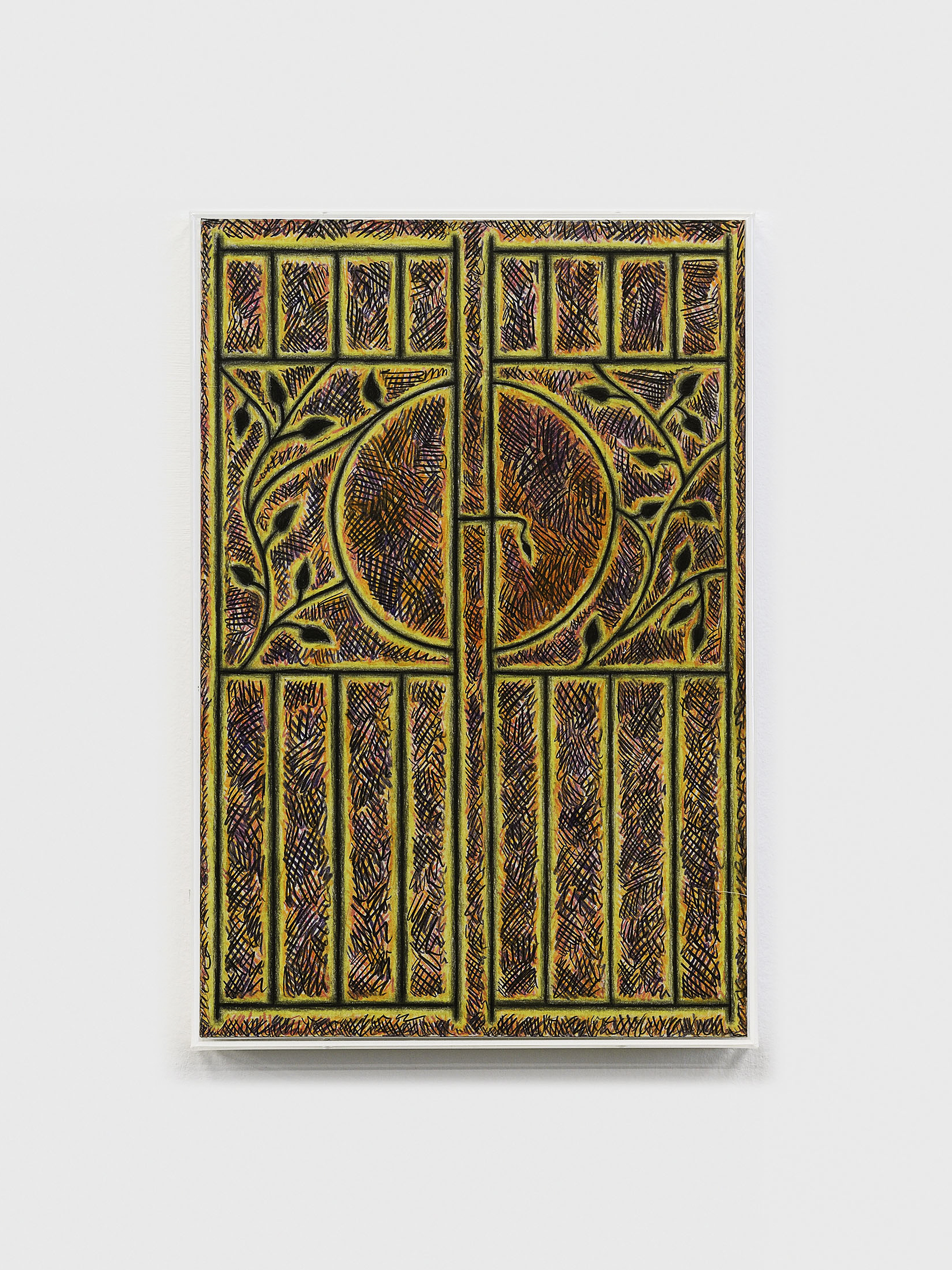 Gate, 21 x 31cm, coloured pencil on paper in perspex frame, 2019