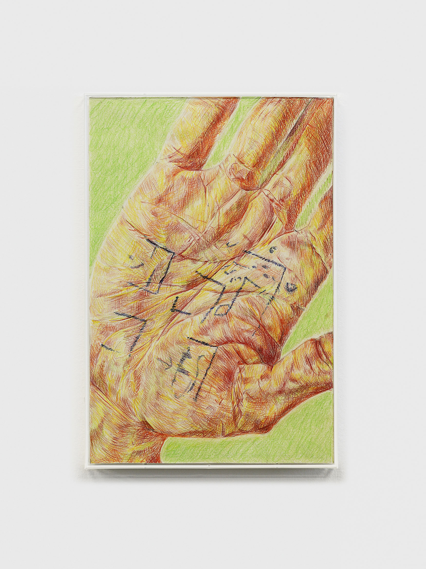 Midnight Plans (Hand), 21 x 31cm, coloured pencil on paper in perspex frame, 2019